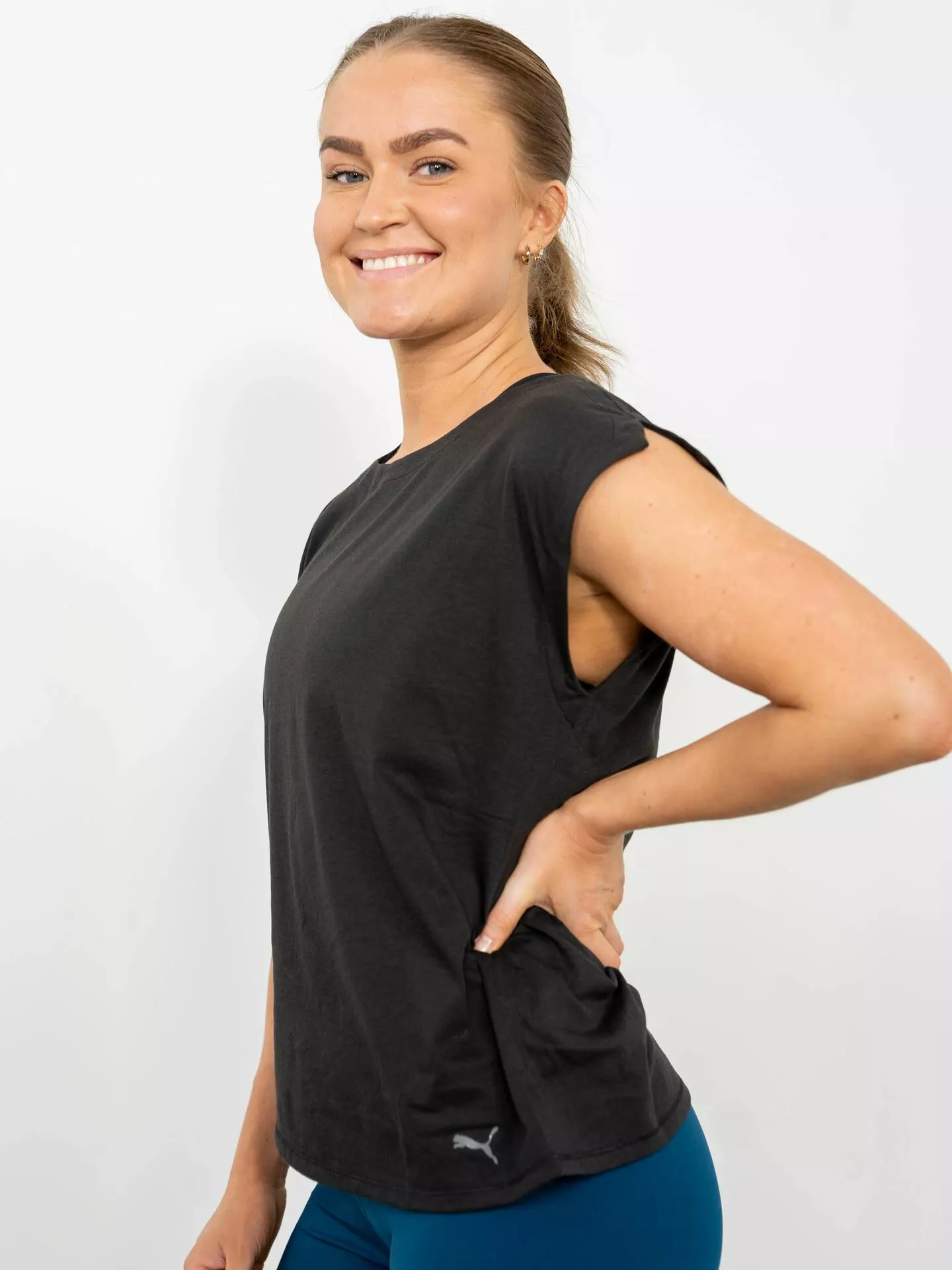 Comfy and classy! Studio Foundation tee fra Puma er både og. Den brede runde halsen, ermene med splitt og rysjedetaljene skaper en slank, flatterende silhuett, mens dryCELL-finishen til transporterer fuktighet bort fra huden mens du trener – noe som betyr at du kan holde deg så avkjølt og komfortabel under hele økta.